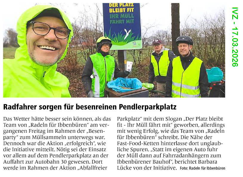 Auch dieses Jahr haben wir uns an der Besenparty der Stadt Ibbenbüren beteiligt. Wie jedes Jahr lohnt sich der Einsatz, leider! Am Freitag, den 13. März 2026 haben wir uns mit Greifern, Müllsäcken und Fahrradanhänger auf den Weg in Richtung Pendlerparkplatz Münsterstraße/A30 gemacht.
